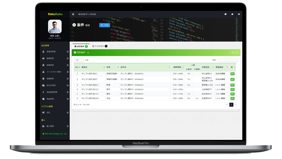開発案件情報をプロジェクト単位で管理を行います。所属事業(部署)を設定することにより、楽楽に事業(部署)の業績を算出できます。
