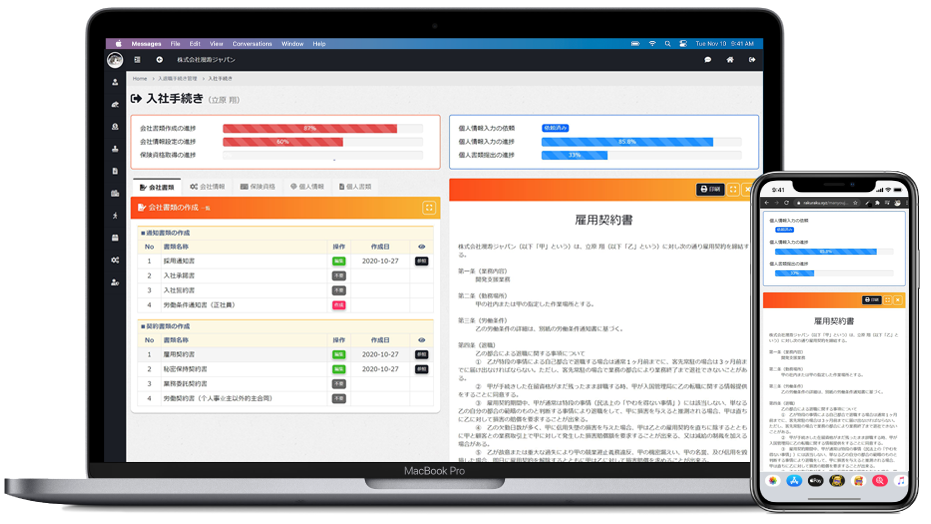 入退社手続きや雇用契約書類などもペーパーレスでカンタン、ワークフロー機能があるから手続きの完成状況をすぐに把握でき、業務の効率化につながります。