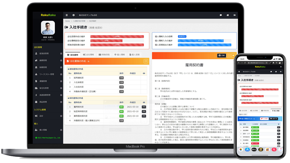 従業員の入社手続きをはじめ、社会保険算定基礎届の作成や年末調整、退職手続きまで、様々な労務手続きがペーパーレス化、効率化はもちろん、従業員情報の一元管理や、蓄まったデータの有効活用も楽楽に。